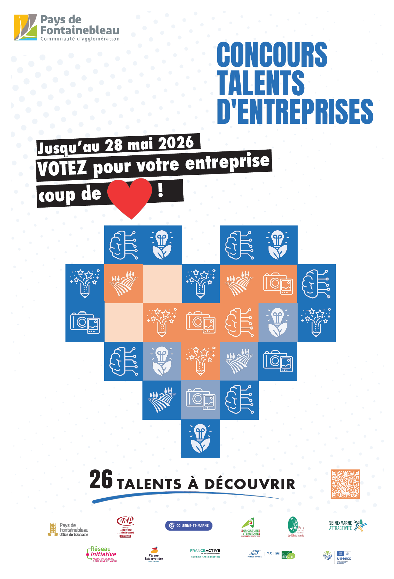 25 candidatures d’entreprises locales à découvrir pour cette nouvelle édition ! Du 17 avril au 28 mai 2026, c’est au public de voter pour désigner le lauréat « Coup de cœur » de la 6e édition du Concours Talents d’Entreprises du Pays de Fontainebleau !
